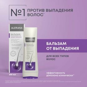 Бальзам-ополаскиватель с увлажняющими компонентами Alerana для восстановления структуры, уменьшения ломкости и облегчения расчесывания волос. Бальзам-ополаскиватель содержит каскад натуральных компонентов, которые обеспечивают комплексное действие:• усиливают обмен веществ, обеспечивая активное питание волосяных фолликулов• укрепляют сцепление чешуек на стержне волоса• восстанавливают структуру и уменьшают ломкость волос• облегчают расчесывание и придают волосам блескВ состав бальзама входят компоненты для уменьшения выпадения, восстановления структуры и укрепления волос. Активные компоненты:• Кератин проникает в глубокие слои волоса, устраняет повреждения и укрепляет сцепление чешуек на стержне волоса, защищая волосы от сухости и ломкости• Церамиды благоприятно воздействуют на структуру поврежденных волос, укрепляют сцепление между чешуйками кутикулы, устраняют повреждения и отслаивание клеток на стержне волоса• Провитамин В5. Обладает сильным увлажняющим эффектом, восстанавливает структуру волоса и поврежденные секущиеся концы• Натуральные экстракты крапивы и лопуха. Останавливают процесс выпадения и способствуют росту сильных и здоровых волос, усиливают обмен веществ, придают волосам здоровый блеск• Экстракт пижмы. Предотвращает выпадение, уменьшает ломкость, способствует устранению перхоти• Бетаин обеспечивает пролонгированное увлажнение волос и кожи головы, способствует удержанию естественной влаги в волосах, обладает кондиционирующими свойствами, усиливает естественный блекс волосРезультат: здоровые и блестящие волосы без утяжеления, ломкости и выпадения.