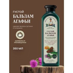 Содержание в бальзаме Рецепты бабушки Агафьи густой укрепление сила и рост волос талой воды обеспечивает кондиционирование волос, настой трав, белый мед и репейное масло служат увлажнением и питанием слабому волосу, укрепляют и стимулируют его рост. Сочетание активных питательных компонентов дарит вашим волосам комплексную заботу: укрепление, силу и рост.