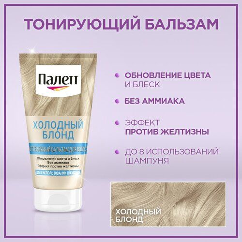 "Оттеночный бальзам для волос Палетт для идеального блонда без эффекта желтизны. С аммиаком. Благодаря обновлению цвета и уходу в перерывах между осветлением волосы выглядят здоровыми и ухоженными. Оттеночный бальзам Холодный блонд придает холодный оттенок светлым волосам. Подходит для волос от самого светлого до средне-русого оттенка.
