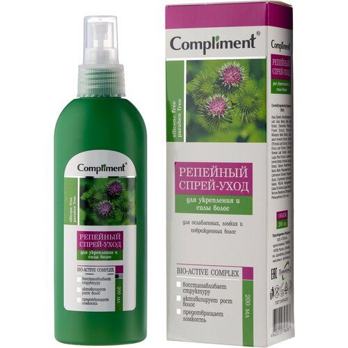 НАЙТИ ВЫГОДНЕЕ - Compliment Репейный спрей-уход для укрепления и силы волос, 230 г, 200 мл, бутылка