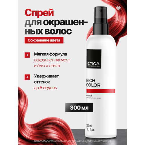 Двухфазный спрей для ухода за окрашенными волосами EPICA Professional Rich Color объемом 300 мл обеспечивает надежную защиту и сохранение цвета на длительный срок.