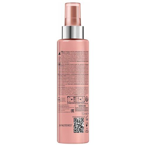 Как работает: Универсальная антиоксидантная термическая сыворотка против пушения для чувствительных или поврежденных окрашенных волос представляет собой белую жидкость.