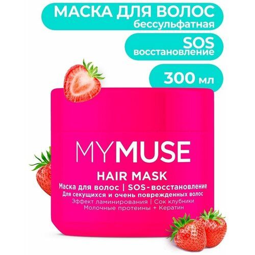 Маска для волос SOS восстановление. С эффектом ламинирования кератин + керамид. Для секущихся и очень повреждённых волос. с соком клубники и молочных протеинов. Маска защищает и питает, предотвращает ломкость и сечение кончиков. Делает локоны послушными и облегчает укладку. Для достижения максимального эффекта рекомендуется применять вместе с бальзамами и шампунями для волос MY MUSE.