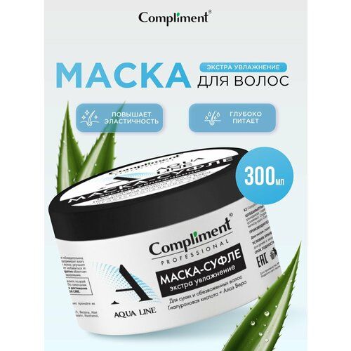 Compliment Professional Aqua Line Маска-суфле для экстра увлажнения волос 300мл. Красивые и здоровые волосы – это не только результат правильного ухода, но и залог уверенности в себе и привлекательности. Одним из главных средств по уходу за волосами является маска для волос, которая позволяет восстановить структуру волос, придать им блеск и силу. Интенсивно увлажняющая маска для волос суфле Комплимент линии Аква лине с ухаживающим комплексом создана специально для обладательниц сухих и обезвоженных волос. Благодаря входящим в состав компонентам маска для волос питательная глубоко питает и увлажняет, задерживает влагу внутри волос, делая их мягкими, эластичными и ухоженными. Гиалуроновая кислота: