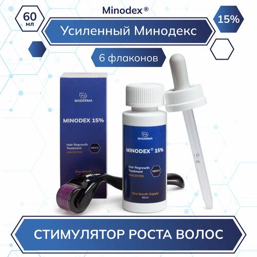 Maderma Minodex 15% в форме лосьона. 6 флаконов со штатной пипеткой и мезороллером - ваш запас на 6 месяцев. Усиленное косметическое средство эффективно помогает росту волос за счет питания волосяных луковиц и стимуляции подкожного кровотока. Спящие фолликулы из состояния покоя переходят в цикл роста. За счет этого и начинают расти новые волосы. Косметическое средство имеет доказанную эффективность и используется трихологами по всему миру с 80-х годов.