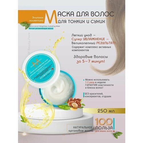 Оживление, преображение и глубокое восстановление сухих тонких волос всего за 5 минут. Легкая увлажняющая маска (Moroccanoil Weightless Hydrating Mask) обеспечивает высокоэффективное, насыщенное кондиционирование и оздоровление ослабленных волос, требующих деликатного ухода. Ее невесомая формула, насыщенная богатым антиоксидантами маслом арганы и питательными компонентами, увлажняет и одновременно улучшает текстуру волос, делая их блестящими, эластичными и послушными, защищая от неблагоприятных воздействий, в том числе возникающих при горячей укладке. Дополняющее состав масло ши успокаивает и увлажняет, обеспечивая волосы и кожу головы необходимыми питательными элементами, а гидролизованный растительный белок восстанавливает упругость, эластичность и прочность пористых, поврежденных волос.