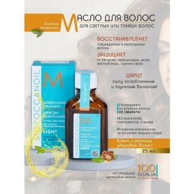 Восстанавливающее масло для волос Moroccanoil Treatment Light обладает всеми свойствами оригинального восстанавливающего масла Moroccanoil Treatment, но имеет более легкую текстуру и формулу. Разработанная специально для тонких и светлых волос, она обеспечивает еще более невесомый и деликатный профессиональный уход за волосами. Уникальные свойства продукта позволяют ему стать незаменимой основой для ухода за волосами, идеально подходящей для использования в качестве кондиционера и средства для укладки. Насыщенное богатым антиоксидантами маслом арганы, укрепляющими протеинами и повышающими блеск витаминами, средство облегчает расчесывание, ускоряет время высыхания, усиливает блеск, делает волосы гладкими и послушными, питая и укрепляя их при каждом использовании. Облегченная формула дарит волосам восхитительный блеск и мягкость. Укрепляет слабые и безжизненные волосы.