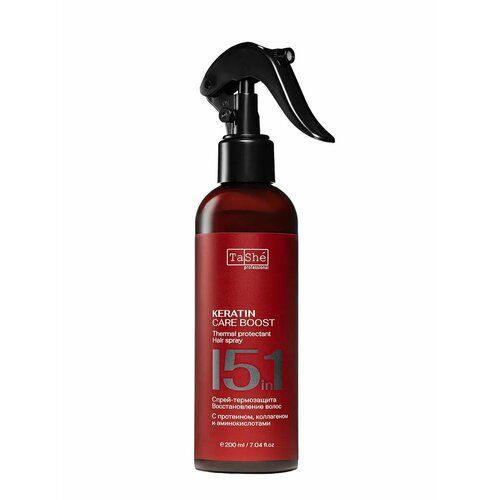 Спрей для волос термозащита 15 в 1 Tashe с кератином и аминокислотами - это профессиональный уход за волосами в домашних условиях. Продукт обеспечивает надежную термозащиту при сушке феном и горячих укладках, а также облегчает расчесывание, устраняет спутанность и пушистость.