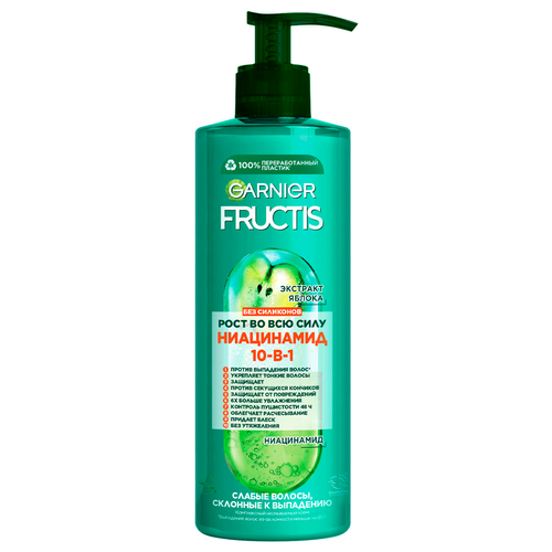Ослабленные волосы, склонные к выпадению?Fructis представляет систему укрепления волос, которая совмещает в себе суперфрукт натурального происхождения с активными ингредиентами. Ваши волосы выглядят более здоровыми и сильными. Рост Во Всю Силу 10 в 1 обогащен суперингредиентами: Формула с экстрактом яблока и ниацином возвращает силу ослабленным волосам, склонным к выпадению.Результат: Ваши волосы более сильные и гладкие, они более устойчивы к ломкости, повреждениям и секущимся кончикам.