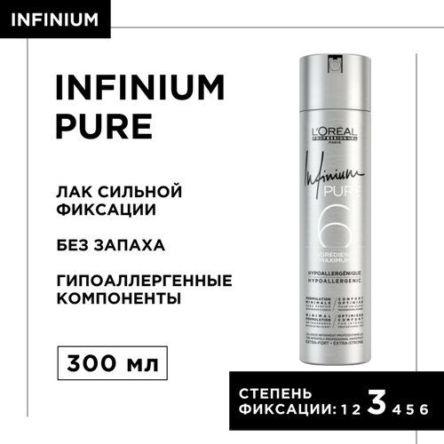 Команда L`Oréal Professionnel в очередной раз сделала невозможное, создав лак без запаха Infinium Pure, который имеет в своем составе всего 6 гипоаллергенных ингредиентов, не вызывающих чувства дискомфорта при работе. Этот лак, сочетая в себе качество и эффективность своего предшественника – профессионального лака Infinium, а также комфорт и удобство в работе, обречен на любовь женщин по всей России. Для всех типов волос. Мгновенная профессиональная фиксация. Гарантированный контроль результата за счет высокой концентрации фиксирующих частиц. Не оставляет запаха и следов на волосах и одежде. Не вызывает аллергии.