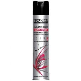 Прелесть Лак для волос Professional Ultra Power экстремальной фиксации 225 мл Лак для волос Прелесть Professional "Ultra Power" обеспечивает экстремальную фиксацию на 24 часа. Средство для укладки волос подходит для волос азиатского типа и создания сложных причесок. Преимущества лака для волос:- Эффективно и надежно фиксирует и защищает укладку даже в условиях повышенной влажности. - Укрепляет и предотвращает ломкость волос. - Придает волосам блеск и дополнительный объем. - Быстро высыхает, не склеивает волосы. - Снимает статическое электричество, легко удаляется расческой, не оставляет следов. - Защищает от пересушивания и от UV-лучей. - Обладает нейтральным ароматом. Объем средства для укладки: 225 мл. В основе комплекс DiProFactor сочетает в себе современные фиксирующие компоненты и витамины, благодаря чему обеспечивается двойной усиленный эффект - длительная естественная фиксация без склеивания и защита волос в любых климатических условиях. Прелесть Professional - являются салонными профессиональными средствами для использования в домашних условиях. Состав: Alcohol Denat. (Ethanol) 46,03% vol isobutane, propane, acrylates/t-butylacrylamide copolymer, aqua, acrylates copolymer, aminomethyl propanol, butane, parfum, panthenol, isopropyl myristate, linalool, coumarin, hydroxycitronellal.