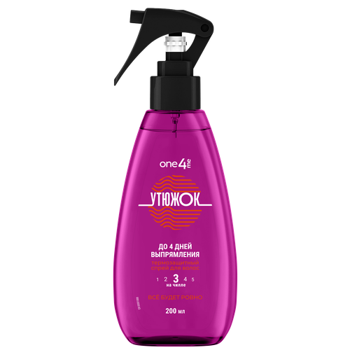 Термозащитный спрей для волос от бренда ONE4ME, модель "Утюжок", обеспечивает среднюю степень фиксации и предназначен для надежного ухода за вашими волосами. Объем флакона составляет 200 мл, что позволяет использовать его длительное время.