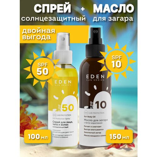 НАЙТИ ВЫГОДНЕЕ - Набор для загара EDEN Sun series спрей солнцезащитный для лица, тела и волос SPF 50 + Масло для загара SPF 10