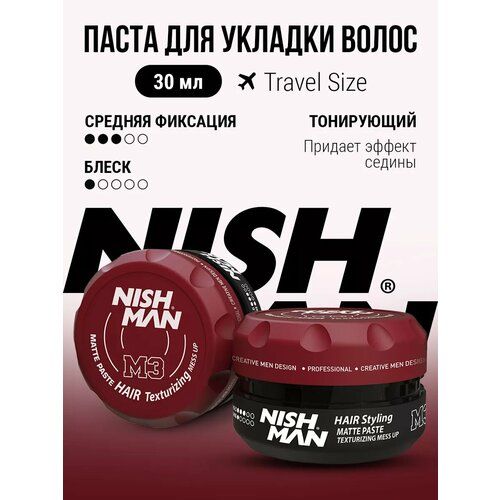 С радостью познакомим Вас с пастой для укладки волос NISHMAN М3 - это высококачественная средство для укладки волос, по структуре имеет пластичную консистенцию, которая обеспечивает среднюю фиксацию и контроль над прической на протяжении всего дня. Паста М3 обладает уникальным эффектом тонирования и придания пепельного цвета волосам. Паста подходит для всех типов волос и длин и легко смывается. Одним из главных преимуществ Нишман М3 является его уникальная формула, разработанная с использованием самых современных технологий. Эта формула обеспечивает длительную фиксацию, придание пепельного цвета и контроль над волосами в течение всего дня. Кроме того, паста легко наносится на волосы, уход занимает всего лишь 3-5 минут вашего времени и держатся превосходно в течение дня Стайлинг для укладки волос идеально подходит для создания различных причесок, от классических до современных. Благодаря своей фиксации и контролю, стайлинг позволяет создавать укладки с любой степенью сложности и детализации. Продукцию NISHMAN используют профессионалы в работе, что говорит о высоком качестве. Косметика идеально подходит для повседневного использования, она не наносит никакого вреда волосам. Реализуется в компактной баночке (100 и 30мл), выполненной в фирменном стиле турецкого бренда, которую удобно брать с собой в дорогу. Косметика предназначена для мужчин, которые хотят выглядеть ослепительно весь день. Мужская косметика NISHMAN станет отличным подарком мужчине на любой праздник. Отлично подойдет для использования дома, так и для работы в салонах красоты и барбершопе.