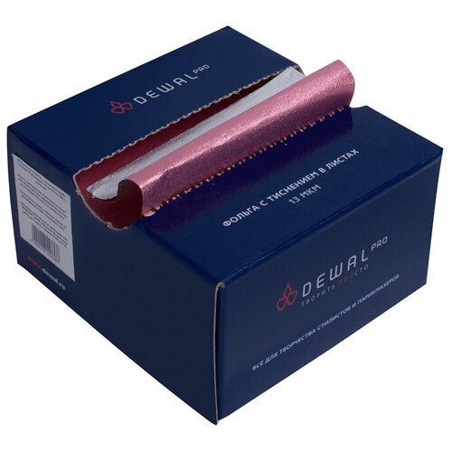 Фольга DEWAL с тиснением в коробке, розовая ,13 мкм, размер 127 мм*279 мм ( 500 листов/кор)Фольга DEWAL 02-13 pink для любых техник окрашивания с тиснением в упаковке.