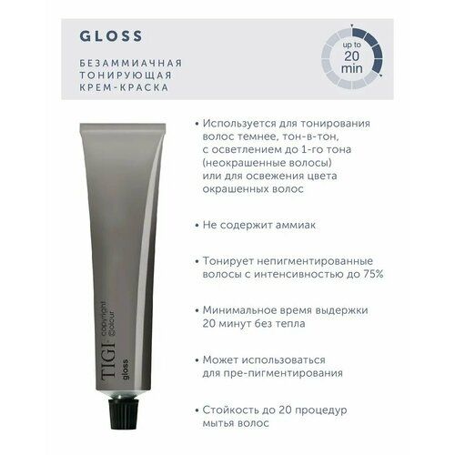 Британский бренд TIGI для бережного окрашивания ваших локонов создал «Крем-краску тонирующую» без аммиака, которая закрашивает седину на 75 %. Она сохранит насыщенность цвета волос, усилит его сияние, подарит удивительный блеск. Copyright Colour Gloss не повреждает структуру волоса, сохраняет целостность кортекса. При окрашивании вы можете использовать любой прием ее нанесения, ведь краска удобно наносится и легко распределяется по всей длине прядей. Подходит «Крем-краска тонирующая» для полного окрашивания, тонирования и восстановления цвета. Ею можно воспользоваться для препигментации, тогда, когда вы хотите сделать волосы более темными. Стойкое средство сохраняет насыщенность до 20 раз мытья головы.