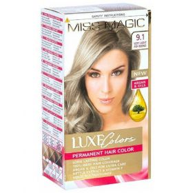 НАЙТИ ВЫГОДНЕЕ - Miss Magic Luxe Colors Стойкая краска для волос c экстрактом крапивы, витамином F и кератином, 9.1 очень светлый пепельный блондин, 108 мл