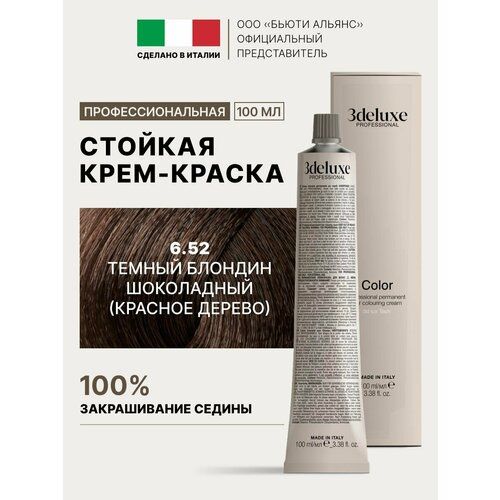 Итальянская высокопигментированная краска для волос с экстрактом календулы и масом арганы 3deluxe professional тон 6.52 темный блондин шоколадный (красное дерево). Натуральный оттенок группы красно медного направления мягко подчеркивает красоту волос, а ухаживающий состав, подобно бальзаму, обладает антиоксидантным, увлажняющим и стабилизирующим свойствами. Маленькое содержание аммиака и большое количество полезных компонентов защищают от негативного воздействия окружающей среды, сохраняют блеск, насыщенность цвета и качество волос до 50 раз мытья. Насыщенный пигмент фиолетового каштанового направления бережно прокрашивает пряди. Покрытие седины 100%.