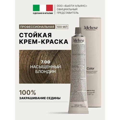Итальянская высокопигментированная краска для волос с экстрактом календулы и масом арганы 3deluxe professional тон 7.00 насыщенный блондин. Холодный оттенок группы натуральный русый мягко подчеркивает красоту волос, а ухаживающий состав, подобно бальзаму, обладает антиоксидантным, увлажняющим и стабилизирующим свойствами. Маленькое содержание аммиака и большое количество полезных компонентов защищают от негативного воздействия окружающей среды, сохраняют блеск, насыщенность цвета и качество волос до 50 раз мытья. Насыщенный пигмент каштановый мокко бережно прокрашивает пряди. Покрытие седины 100%.