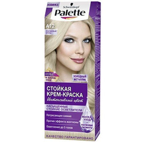 Краска для волос Palette А12 - Платиновый блонд производится в Германии и не содержит спирта. Вид окрашивания – стойкое, текстура – крем.