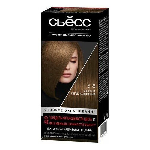 Стойкая крем-краска для волос Сьёсс Ореховый светло-каштановый 5_8 с концентрированными цветовыми пигментами и системой против повреждений. Пигменты красителя глубоко проникают в волокна волоса, позволяя добиться интенсивности цвета до 10 недель и профессионального закрашивания седины. Ухаживающая технология Salonplex реставрирует повреждённые связи в структуре волоса и восстанавливает волосы изнутри. Формула с кератином покрывает кутикулу волос, делая их более мягкими и гладкими. Для визуально улучшенного качества волос* и до 80% меньше ломкости волос*. Подходит для волос от каштановых до чёрных оттенков. Для волос с любым содержанием седины. Стойкое окрашивание. *по сравнению с волосами, окрашенными без применения технологии Salonplex.