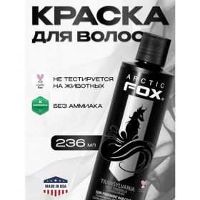 Arctic Fox Transylvania — краситель черного цвета, вымывающийся через синий тон. Этот краситель угольного оттенка красиво и главное, натурально, смотрится на волосах, закрашивая седину или неудачные следы от прошлых окрашиваний. Запах винограда, который характерен для пигментов от Arctic Fox, делает процесс окрашивания ещё более приятным и комфортным. Формула Arctic Fox не содержит вредны спиртов, а вся продукция имеет сертификаты Cruelty Free. Бутылочка имеет объем 236 мл, а значит красителя хватит для окрашивания волос ниже лопаток.