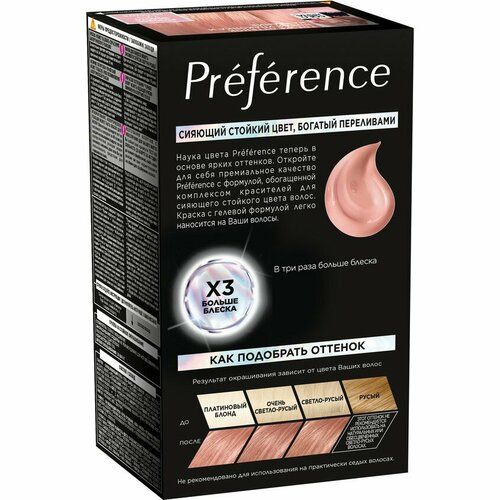 Краска Preference обеспечивает в 3 раза больше блеска, который сохраняется до 8 недель. В комплекте с краской идут флакон-аппликатор с проявляющим кремом (60 мл) и усиливающий цвет бальзам (54 мл), обогащенный UV-фильтром и витамином Е.