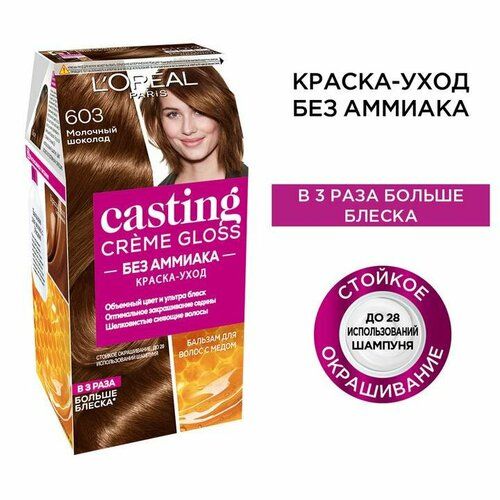 L'Oreal Paris Краска-уход для волос Casting Creme Gloss, 603, Молочный шоколад, 180 мл без аммиака не наносит вред, сохраняет структуру, придает волосам здоровый блеск. Соблазнительный цвет, сияющие и гладкие волосы с новым бальзамом на основе натуральных ингредиентов.