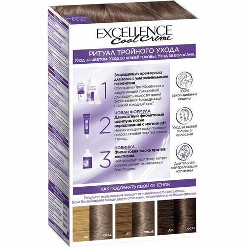 Стойкая крем-краска для волос Excellence Cool Crème – это тройной уход и 100% закрашивание седины. Excellence Cool Crème – это бренд внутри бренда Тройной уход крем-краски заключается в инновационных формулах. Уход за цветом, уход за кожей головы, уход за волосами. 1. Крем-краска защищает волосы. В уникальный состав входят: коллаген, который уплотняет волосы, керамиды, которые закрывают кутикулы и позволяют получить более долгий и стойкий результат окрашивания, технология про-кератин, которая восстанавливает повреждения волос. 2. Фиолетовый шампунь с мягким pH не только восстанавливает кожу голову после окрашивания, но и способствует нейтрализации желтизны. 3. Фиолетовая маска питает волосы и нейтрализует желтизну благодаря высокой концентрации фиолетовых пигментов. Состав упаковки: Флакон крем-краски, флакон-аппликатор с проявляющим кремом, фиолетовый шампунь, фиолетовая маска, инструкция, пара перчаток.