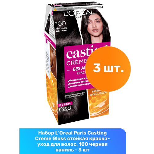 Краска для волос L'Oreal Casting Creme Gloss тон 100 - Черная ваниль - это высококачественное средство для окрашивания волос от известного бренда L'Oréal Paris. В комплекте три упаковки по 115 мл каждая.
