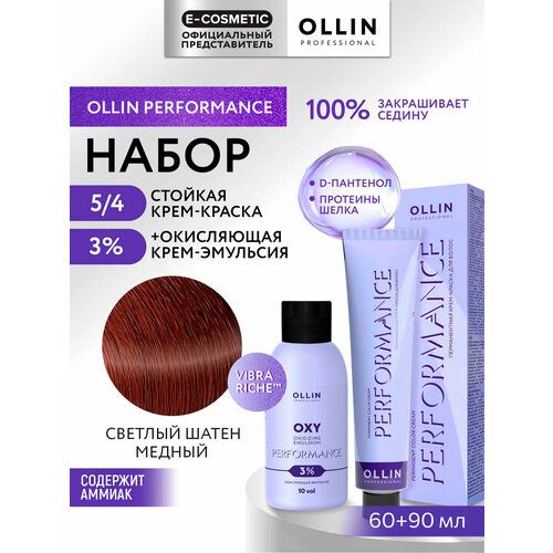 НАЙТИ ВЫГОДНЕЕ - Набор для волос OLLIN PROFESSIONAL Performance: краска 5/4 светлый шатен медный + эмульсия 3 %, 60+90 мл