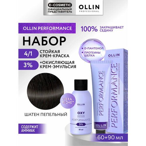 НАЙТИ ВЫГОДНЕЕ - Набор для окрашивания волос OLLIN PROFESSIONAL Performance: крем-краска 4/1 шатен пепельный + эмульсия 3 %, 60+90 мл