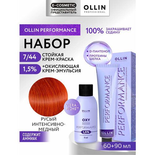 НАЙТИ ВЫГОДНЕЕ - Набор для окрашивания волос OLLIN PROFESSIONAL Performance: крем-краска 7/44 русый интенсивно-медный + эмульсия 1,5 %, 60+90 мл