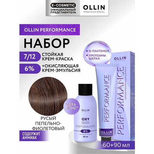 НАЙТИ ВЫГОДНЕЕ - Набор для волос OLLIN PROFESSIONAL Performance: краска 7/12 русый пепельно-фиолетовый + эмульсия 6 %, 60+90 мл