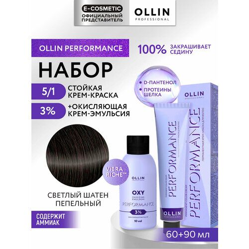 НАЙТИ ВЫГОДНЕЕ - Набор для волос OLLIN PROFESSIONAL Performance: краска 5/1 светлый шатен пепельный + эмульсия 3 %, 60+90 мл