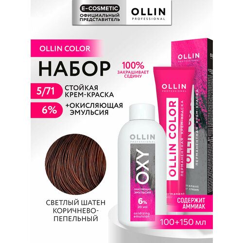 НАЙТИ ВЫГОДНЕЕ - Набор для волос OLLIN PROFESSIONAL Ollin Color: краска 5/71 светлый шатен коричнево-пепельный и эмульсия 6 %, 100+150 мл