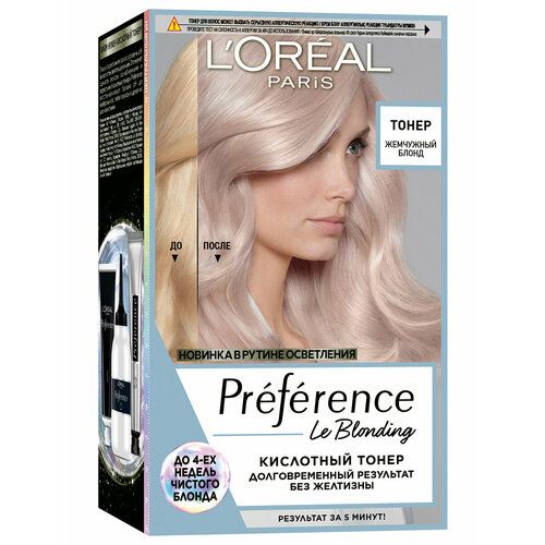 Попробуйте новинку для осветленных волос от L'Oréal Paris: кислотные тонеры PRÉFÉRENCE до 4-Х недель чистого холодного блонда за 5 минут** жемчужный блонд или платиновый блонд – и наслаждайтесь новым красивым оттенком тюбик тонирующего крема (60 мл), флакон-аппликатор с проявляющим кремом (60 мл), укрепляющий кондиционер (54 мл), инструкция, одна пара перчаток.
