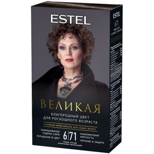 Стойкая крем-краска для седых волос "ESTEL великая" 6/71, темно-русый коричнево-пепельный - это высококачественное средство для стойкого окрашивания волос. Произведенная в России, эта краска обеспечивает равномерное и стойкое окрашивание, закрашивая седину и придавая волосам блеск и мягкость.
