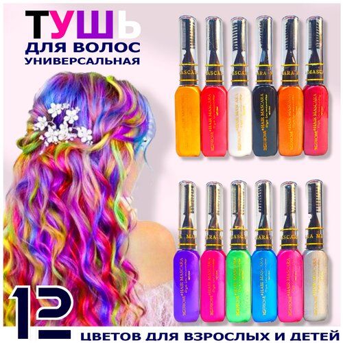 Цветная тушь для волос детская, и для взрослых - для создания потрясающих образов 12 ярких и тоновых цветов в наборе. Тушь для волос и бровей для любого типа волос, цвета и возраста. Тушь можно применять для стильного образа на праздник или Новогодний маскарад, вечеринку или День Рождения. Безопасная краска для волос подходит как для взрослых, так и для девочек. Проявите его и свою индивидуальность с помощью туши для волос. Универсальная смывающаяся тушь по своей консистенции не жирная, как это бывает когда применяются мелки для волос для детей. Тушь подойдет для девочек от 4 лет, и для женщин всех возрастов. Отлично подойдет для окрашивания седых волос. Пигменты яркие и стойкие, смывается тушь легко с помощью воды и шампуня. Расход пигментов маленький - поэтому набора хватит очень надолго. Тушь не засыхает в плотно закрытом стеклянном футляре, в котором двухсторонние кисточки-расчески для нанесения. Краска наносится только на сухие пряди. Лучше вымыть волосы накануне, чтобы на локонах успел образоваться кожный жир. Он поможет средству лечь на пряди ровно, дополнительно защитит структуру волос. Выберите нужные локоны, отделите их от основной массы волос и подколите заколками. Возьмите в руки нужную прядь, хорошо пройдитесь по ней гребешком или расческой с мелкими зубцами. Начинайте наносить средство от корней и по всей длине локона. Если вы хотите закрасить все волосы, начинайте процесс с затылочной области, постепенно двигаясь к макушке. Брюнеткам парикмахеры советуют выбирать яркие цвета, в этом случае окрашивание пройдет быстрее. Экспериментируй с образами весело и ярко