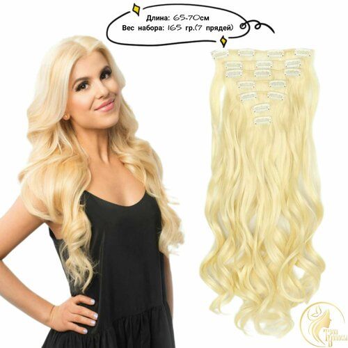 НАЙТИ ВЫГОДНЕЕ - Накладные волосы локонами 65 см, пряди на заколках-клипсах, Блонд (тон 613)