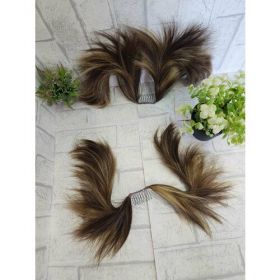 Шиньон представлен в коричневом цвете с желтой мелировкой, что позволяет сочетать его с различными цветами волос и создавать интересные контрасты.