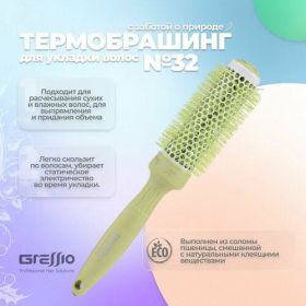 Удобный термобрашинг серии ЭКО от бренда Gressio - верный помощник в создании новых причесок Круглая расческа подходит для использования дома и в парикмахерском салоне. Она обеспечит легкое разделение прядей на пробор, создание объема и придание гладкости самым непослушным волосам. Компактный формат, удобная ручка делают эту расческу незаменимым инструментом для ежедневного использования как профессиональными стилистам, так и обычными девушками. Брашинги серии Wheat fiber с керамическим напылением– это изделия нового поколения, которые создаются с заботой о природе. Основной материал – переработанная пшеница, био-разлагаемая. Благодаря мягким нейлоновым щетинкам бьюти - аксессуар обеспечивает бережный уход за локонами. Нейлон щетины обладает антистатическими свойствами, что делает использование комфортным. Поверхность браша быстро, равномерно нагревается под действием фена, запечатывая чешуйки волос. Керамика и турмалин защищают локоны от потери влаги, предотвращая ломкость и хрупкость прядей в результате сушки горячим воздухом, сохраняя эластичность от корней до кончиков. Круглый продуваемый барабан облегчает процесс создания красивых причесок. Аксессуар подойдет всем, кто мечтает о красивой укладке - от девочек - подростков до взрослых женщин. Укладочное приспособление подходит для натуральных, нарощенных, длинных, коротких, густых, тонких прядей. Ручка эргономичной формы удобно ложится в руку. А компактный размер ручного термобрашинга делает его идеальным дорожным уходовым приспособлением. С помощью этих универсальных инструментов вы сможете создавать как мелкие кудряшки из тонких прядей, так и крупные локоны. Аксессуары подойдут для укладки челки, увеличения прикорневого объема, создания самых разных модных причесок - от повседневного хвостика до высоких праздничных укладок. Принадлежность идеальна для создания начеса, эффекта кудрявых и волнистых волос. Щетку можно использовать для выпрямления вьющихся прядей без использования утюжка или другого выпрямителя.