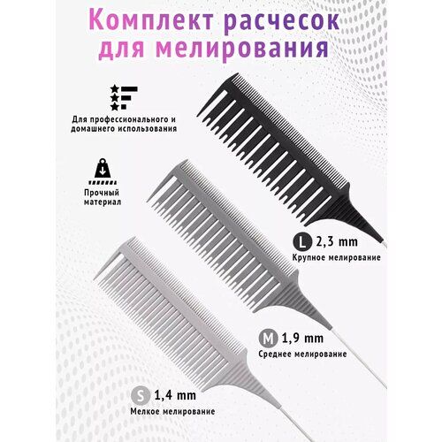 Набор из трёх расчесок для крупного и мелкого мелирования, разработаны не только для профессионалов, но и для домашнего использования. Расчёска для мелирования волос бережно расчесывает ваши волосы. Помогает мастеру быстро и качественно выполнить сложное окрашивание. Обеспечивают равномерное распределение тонких прядей при окрашивании. В итоге получается достаточно мелкое мелирование без эффекта "полосочек" и "швов". С помощью металлического хвостика и отдельного зубца легко разделить волосы на пробор. Данный набор расчесок значительно ускоряет процесс окрашивания и облегчает работу мастера. Локоны равной ширины и толщины остаются на расчёсках благодаря особой форме зубчиков. За счёт эргономичного дизайна удобны при запечатывании фольги. Подходят для большинства типов волос, таких как влажные, сухие, густые или вьющиеся. Расчески для крупного и мелкого мелирования станут Вашими главными помощниками при окрашивании и значительно сократят время процедуры. Наши расчески для мелирования подходят для техники аиртач (airtouch) а это самая современная, сложная техника окрашивания волос, при которой на прядках создаются мягкие плавные переходы тонов. Это позволяет визуально добавить волосам объема и густоты, обесцвечивая не все волосы, а 30-50% их объема. Распутывающий гребень подходят для ежедневного использования волос любого типа, длины и структуры. Модный прибор поместится в сумку с принадлежностями парикмахера, поможет для создания прически, начеса, и расчесывания непослушных, ослабленных и поврежденных волос. Универсальная антистатическая расческа из пластика для вьющихся, кудрявых, волнистых, прямых, наращённых волос безопасна для кожи головы и коней волос, подойдет для легкого расчесывания спутанных густых и тонких прядей. Производятся из экологически чистых, не раздражающих кожу материалов. Отличный подарок женщине любимой, маме, коллеге и просто для себя