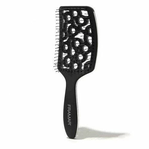 Щетка Framar для сушки волос бережно работает с влажными волосами. Благодаря защитным шарикам на конце каждой щетинки щетка не травмирует волосы и кожу головы, обеспечивая комфорт и нежный массаж. Открытая вентилируемая поверхность щетки позволяет ускорить процесс сушки волос феном. Щетинки выдерживают нагрев до 230 градусов.