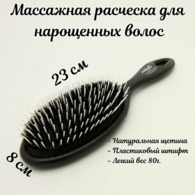 Щетка имеет черный цвет и изготовлена из пластика, что делает ее легкой и удобной в использовании. Материал корпуса и ручки - пластик, а материал щетины - натуральная щетина и пластиковые штифты. Это обеспечивает мягкое и бережное воздействие на волосы, не вызывая раздражения и повреждения.