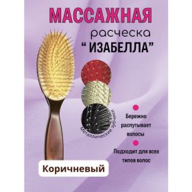 На российском рынке эти массажные щетки давно востребованы и хорошо зарекомендовали себя. Расческа для волос Изабелла. Отличительной особенностью данных щеток, является то, что в процессе их изготовления используются высококачественные, российские, экологичные и сертифицированные материалы. Данные щетки не допускают сечения волос, не повреждают их структуру, не выдирают и не ломают их благодаря применению осветленных алюминиевых игл, с оптимальным диаметром и закругленной головкой на конце. Идеально подходят для расчесывания кудрявых, длинных, наращенных волос. Основание, так называемая подушка щетки, изготавливается из листовой резины, которая имеет высокую степень эластичности и в комплексе с иглами обеспечивает их полную защищенность от электризации (намагничивания), а также производит глубокий массаж головы и корней волос в процессе эксплуатации. Подходит для вычесывания собак и кошек. Производства компании Елабуга УкупрПласт.