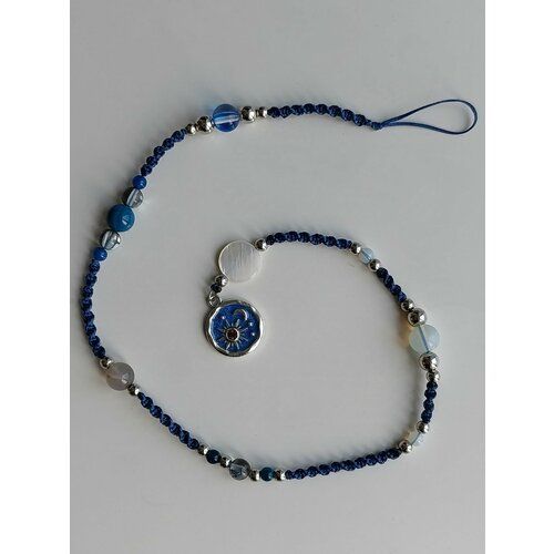 Лула ручной работы на синем вощеном шнуре, бусы опалит, агат, лунный камень, вставка перламутр, подвеска луна.