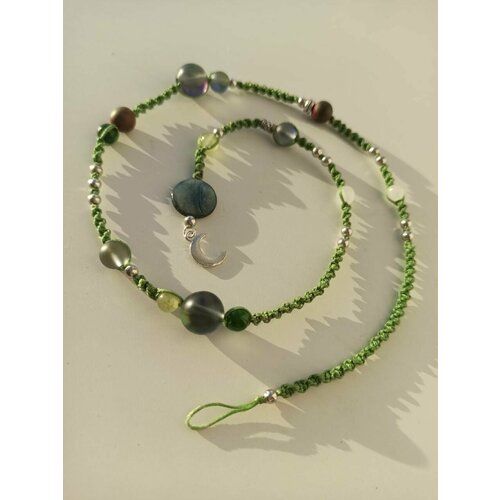 Лула ручной работы на зеленом вощеном шнуре из камня кошачий глаз, яшмы, агата и перламутра, с подвеской луной.