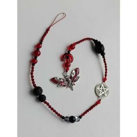 Лула ручной работы на красном вощеном шнуре, бусы агат, вулканический камень, опал, вставка черный череп, луна, подвеска мотылек.