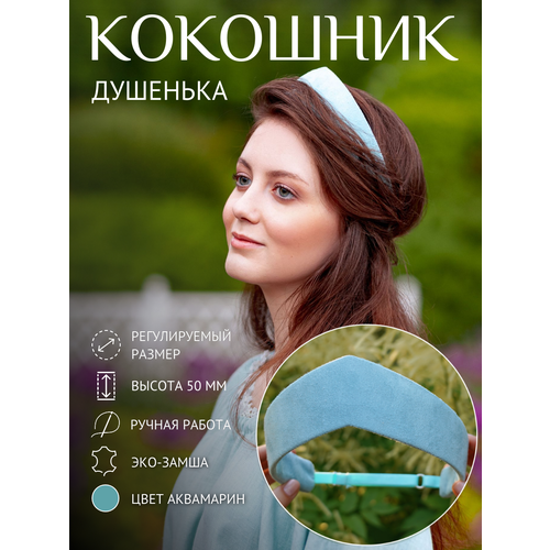 - Кокошник Душенька – идеальный аксессуар для выпускного, свадьбы, корпоратива, похода в театр или любого другого праздничного мероприятия, а так же для повседневного использования. Изготовленный из мягкой искусственной замши аквамаринового цвета, он придаст вашему образу элегантность и шарм. Кокошник подходит не только для русского народного стиля, но также прекрасно сочетается с современными нарядами.